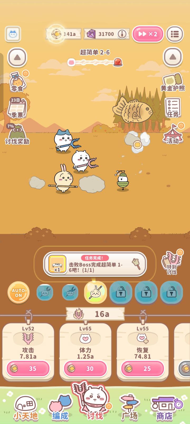 ③游戏玩法:这一块针对这个ip来说感觉...让我不好评价,但休闲娱乐的设定还是很标准的。进入游戏后会有教程,映入眼帘的就是大家见过的讨伐场景,最开始是吉伊和咱们的老八,策划也是有心,两位宝宝从新手教程就在一起。讨伐玩法分普通章节和特别讨伐,讨伐难度会随着进度增加,普通讨伐可获得金币,特别讨伐可获得钻石和金币,特别讨伐需要讨伐证,讨伐证可通过任务获得。