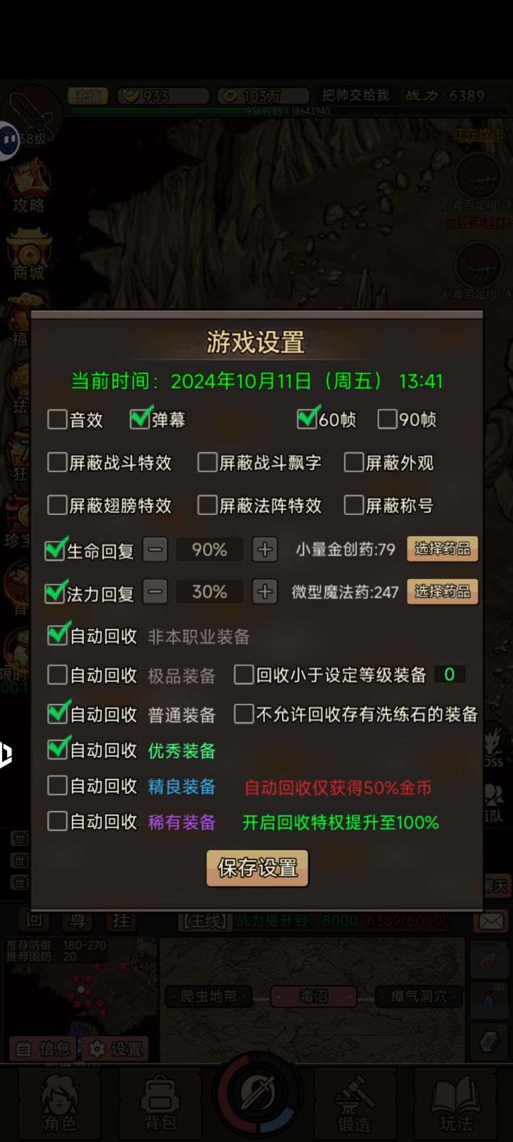 1:进区开永久托管助手,90天的回收特权和战神特权。2:30级衣服礼包和50级头盔必买,30级衣服有减伤,头盔有技能加2。衣服洗技能加一,2500洗不出可以分解,过渡用。3:背包全开,可以当每日充值开,满背包是710. 背包大有用处,可以屯60以上远古装备,合青龙材料。因为我走的路线是先把神符升到100级再做青龙装备。设置那取消非本职业装备回收,等回收价格高时再回收,因为这游戏什么时候都缺金币