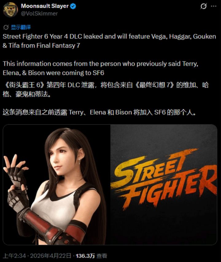 据外媒The Gamer报道,Reddit用户RnK_Clan近日爆料,《最终幻想7》人气角色蒂法、巴洛克(维加)、哈格以及隆的师父刚拳,有望作为新角色加入《街头霸王6》。但该帖子发布后不久便被作者主动删除,由于此人此前曾准确剧透第二季角色阵容,信息具备较高可信度。The Gamer也补充表示,其独立消息源同样传出蒂法未来参战的风声,让这一惊天跨界传闻更具说服力。蒂法作为国民级游戏女神,若真的登