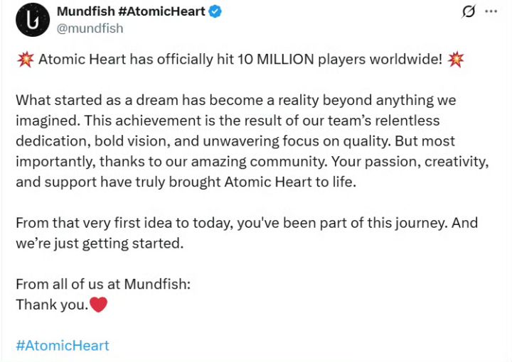 Mundfish制作组官方宣布,《原子之心》玩家数已突破1000万,官方发布了贺图感谢玩家支持。 原子之心是俄罗斯开发商开发的射击动作类角色扮演游戏,机游戏围绕架空世界的第二次世界大战与机器人展开游戏于23年发售仅过了两年多便有千万销量#原子之心 #今天游戏圈发生了啥 #游戏资讯 #资讯评论员