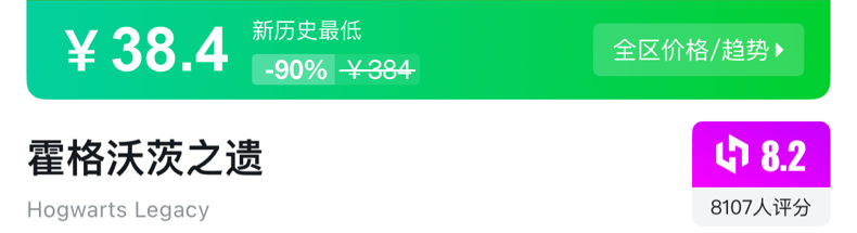 《霍格沃茨之遗》一折新史低¥38.4