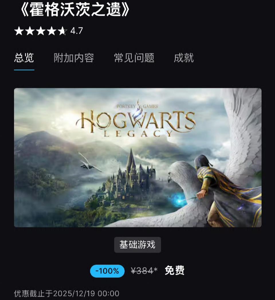 各位玩家请注意,rk在这里给大家整理了一下喜加一游戏动态!Epic Games Store本周的“喜加一”活动带来了一份重磅福利!即日起至2025年12月18日,你可以免费领取广受好评的《霍格沃茨之遗》。领取后游戏将永久入库,随时可下载游玩。· 领取时间:即日起 至 2025年12月18日· 游戏平台:PC (Epic Games Store)· 领取性质:领取后永久拥有《霍格沃茨之遗》