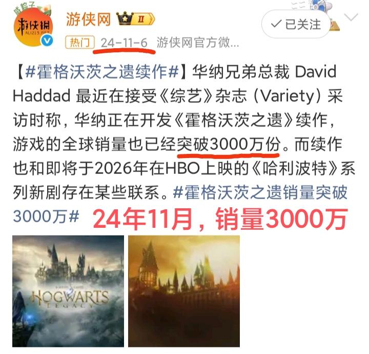 12月18号,《霍格沃茨之遗》官宣,游戏累计销量已突破了4000万份❗❗❗值得一提的是,该游戏在2024年11月就已经突破3000万销量时隔一年多的时间,在Epic商城免费赠送这款游戏的助力下,又新增了1000万销量!这里面估计之前有一半是E宝的功劳……记得12号刚免费送到时候,Epic商城网站都挤崩溃了。“免费入学”霍格沃茨的机会,真的是太香了👍开发团队,记