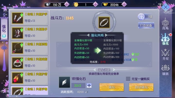 在《御剑连城》手游中,战力是衡量玩家实力是否强大的标准,而高战力也是所有玩家所追求的目标。许多玩家都在努力地堆战力,偶尔还是会经历战力不足的尴尬。刷图刷不过去,组野队被人家嫌弃战斗力低直接请出队伍等。如何才能得到大家认可的战斗力呢?这就需要玩家们去耐心的积累经验了。下面就来说说新手该如何提升战力。1、装备提升我们来先谈谈强化,强化这一块每级都有强化加成,强化等级越高,装备属性也就越好。系统会根