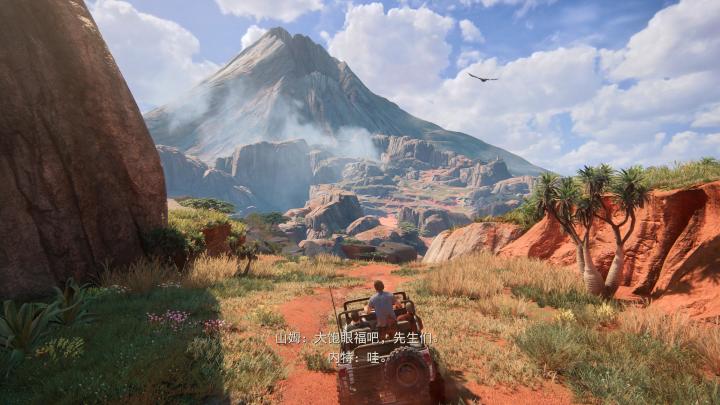 但神秘海域4有着自己的特色——电影化叙事,作为索尼顽皮狗名下的代表作品,神秘海域4完全可以以无UI的形式进行游玩,除去少部分枪战环节,你完全可以把整个视野放在游戏的画面之中,就好像看电影一样,实际上游戏更为强调“潜行”元素,枪械的伤害以及危险收益是远不如潜行击晕敌人的。所以绝大多数情况下,你都可以沉浸式的体验游戏(索尼的第一方都有这个特点),本作即便是2016年的游戏,在画面美术上依旧可以媲美甚至超越新发售的游戏,在游玩之时,我的感受只有一个——这款游戏居然寿命快十年了?无论是宽阔的非洲草原,还是神秘的热带雨林,又或者是充满本土风情的亚非小镇,你都可以感受到顽皮狗对细节的打磨,游戏本体之中有一段飞车追逐运动战,你会驾驶汽车从小镇的最高处驶向城外,在交错混杂的道路中逃出生天,这一段游戏就好像你化身“巨石强森”,体验真正的速度与激情,有趣的是,这段剧情的小镇地图看似是自由行驶,实际上关卡设计师用视觉引导和高度差异,用线性设计欺骗了玩家,让玩家假以为自己是开放地图。