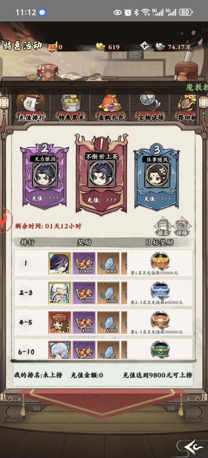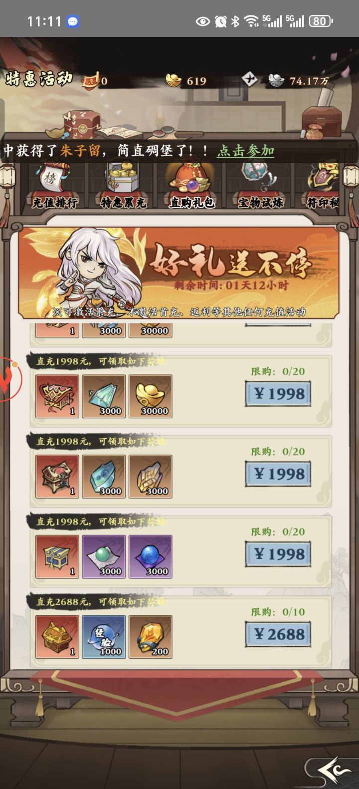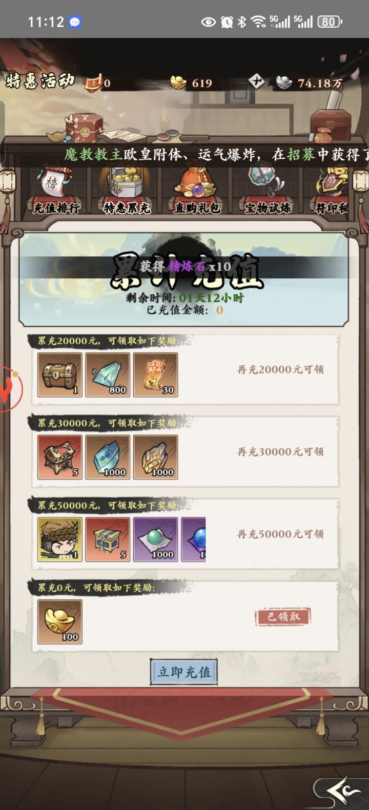 快跑,快跑,第一天活动累充5万rmb当活动第一,活动礼包最高2688rmb限购十次