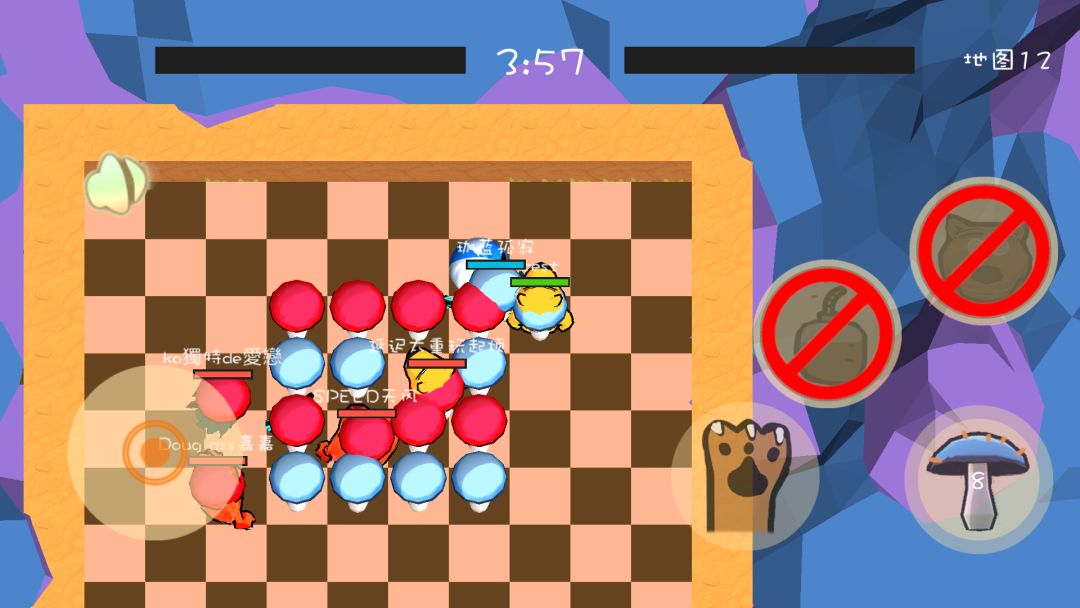 如何获得分数? 用蓝蘑菇围住红蘑菇会发生爆炸,爆炸的红色蘑菇会变为分数。