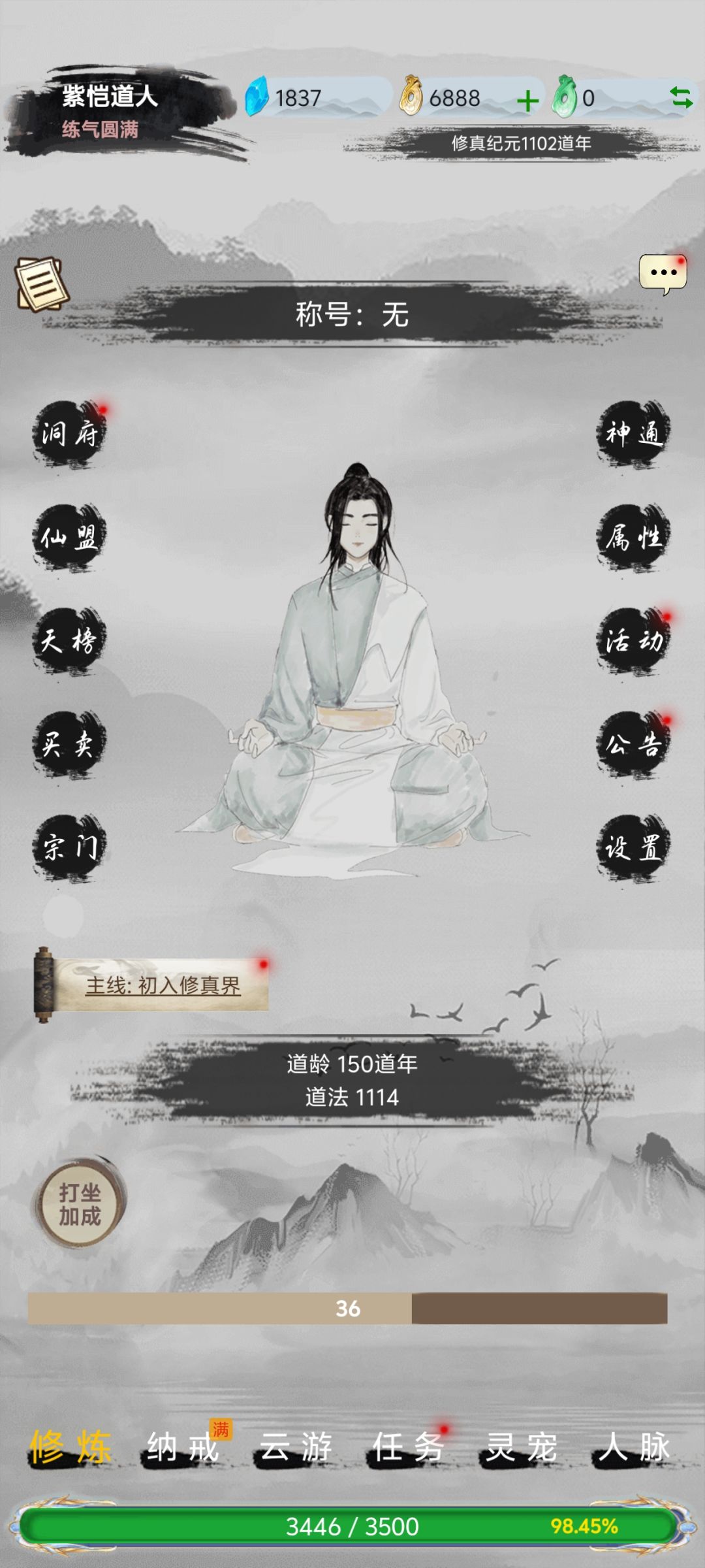 本游戏为放置类游戏,主打休闲,不追求进度,利用碎片时间玩,每日花费时间不超过15分钟,以下功略适合0氪微氪玩家 1.进游戏后选择服务器,各服务器没差别,但是建议选内测一区,因为里面都是高阶仙人(平均等级大罗金仙圆满),所以打坐会有低境界加成(凡人阶段1000%)。 2.进游戏后24小时内点击修炼界面人物右边一列最后一行的“设置”,可填写接引码NbDYZ7DqJad4y3B(200仙玉的奖励),兑换