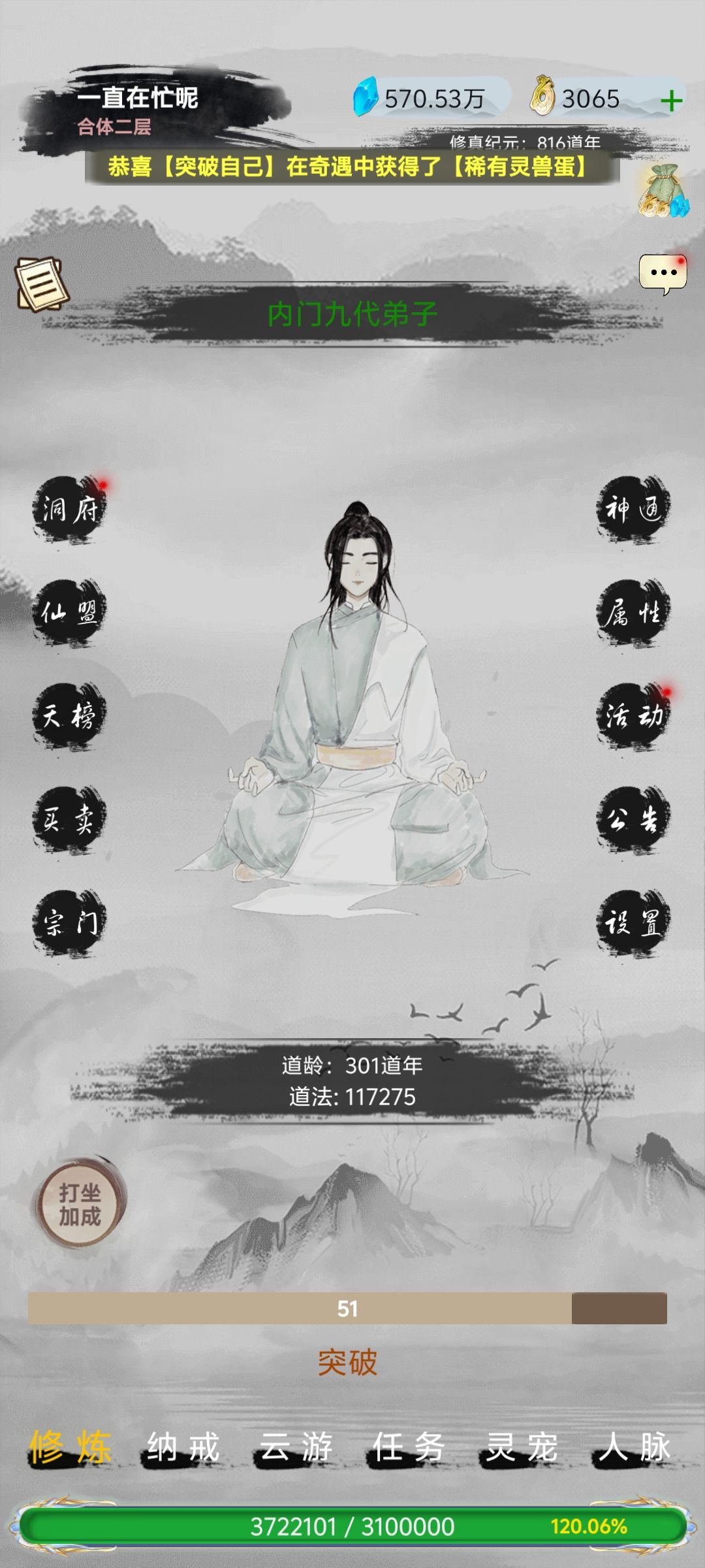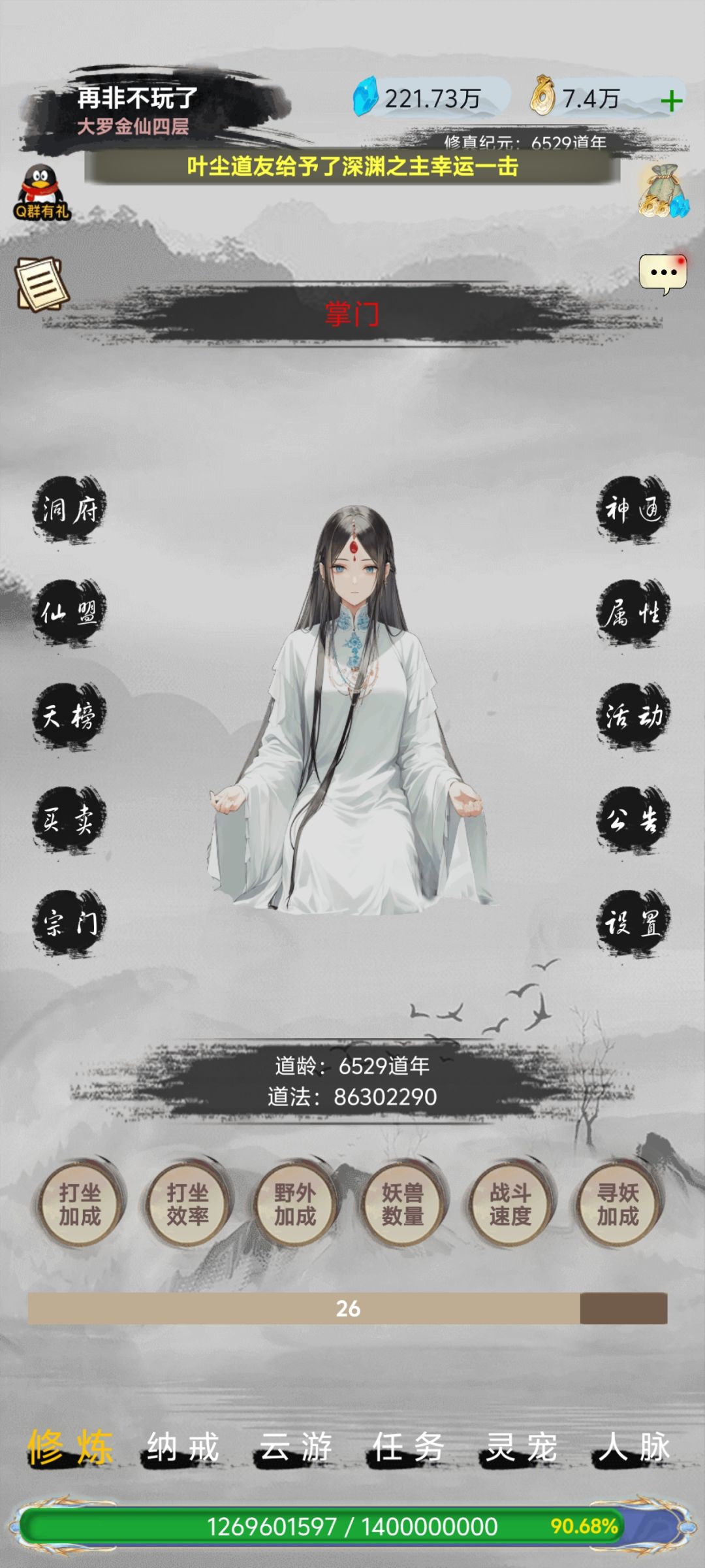 这个游戏主打一个升级游戏,在野外地图获得各个等级的装备,切等级前期过于好升,强烈建议在分身以下,不要强化装备和洗炼装备,因为前期装备更新换代太快 ④第4种方法在活动界面中的观影福利中,尽可能把视频全部看完 ⑤每日任务可获得近100仙玉 三、仙玉使用利益最大化篇 (从上而下为优先级) ①获得仙玉后,先不要进入商店,等进入巩基期时升级洞府,有多少仙玉就升多少,洞府升满之后加百分百的经验,比不