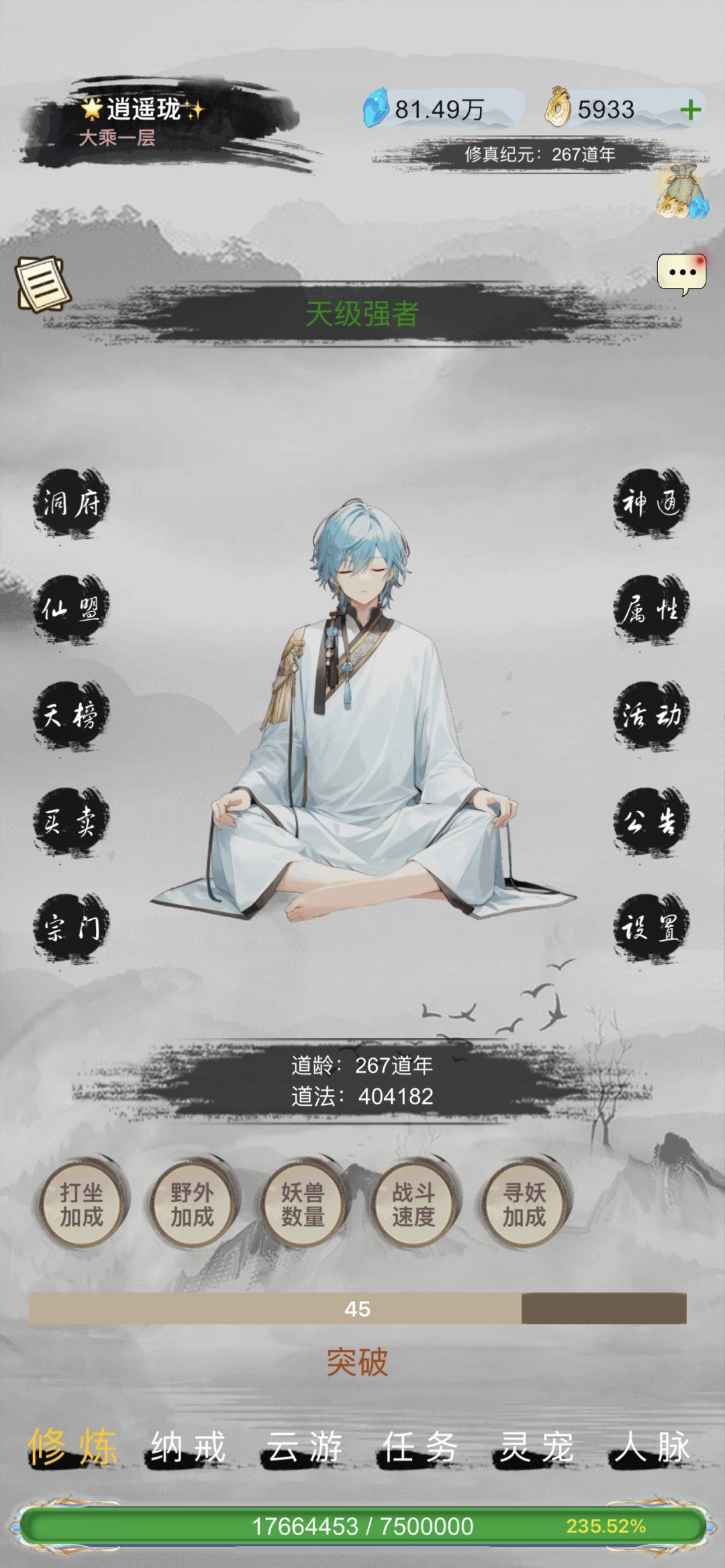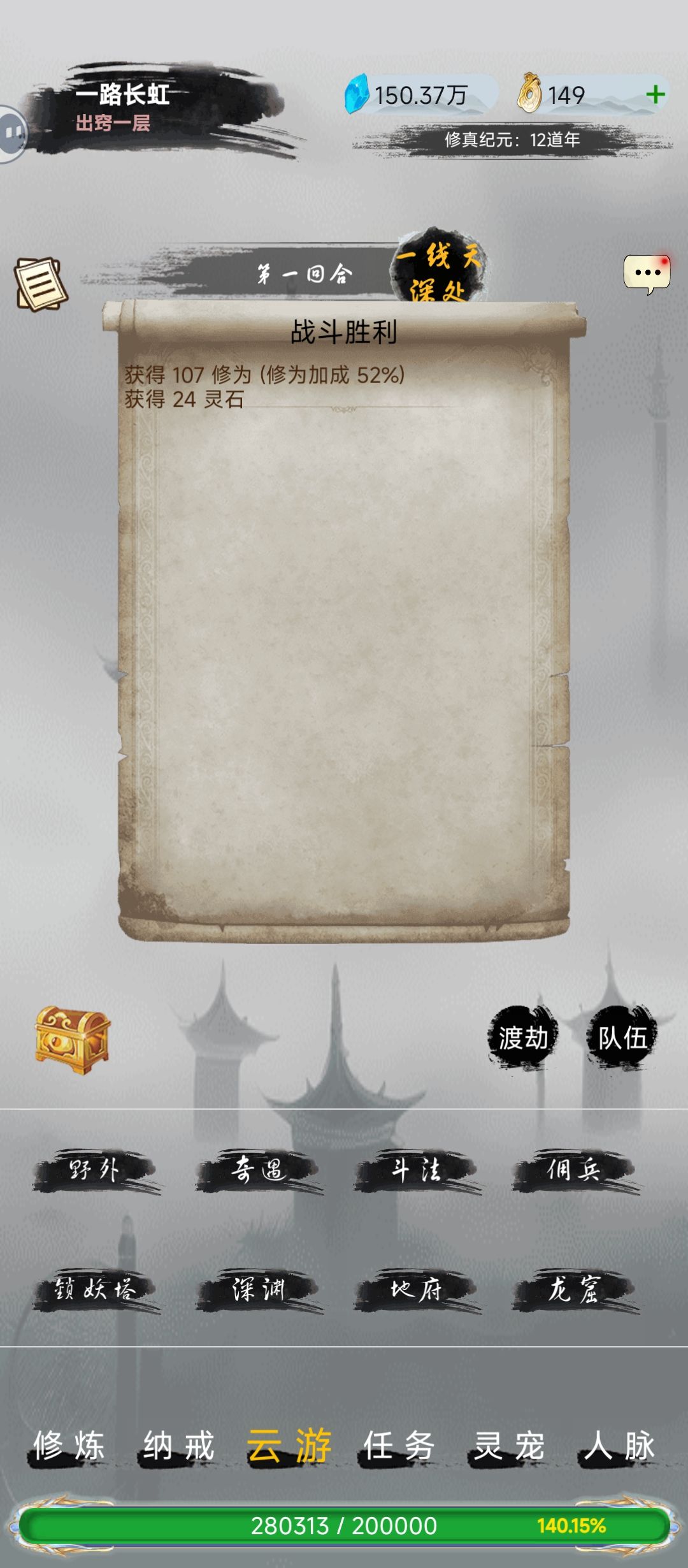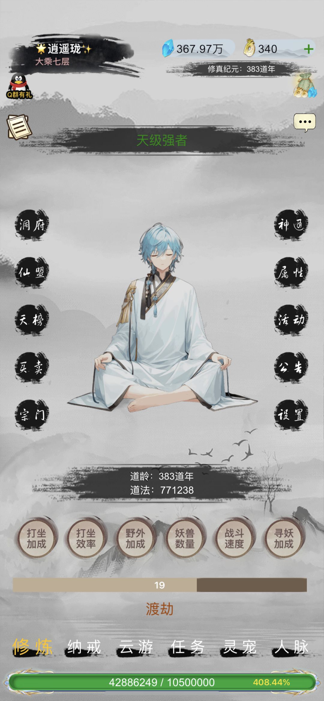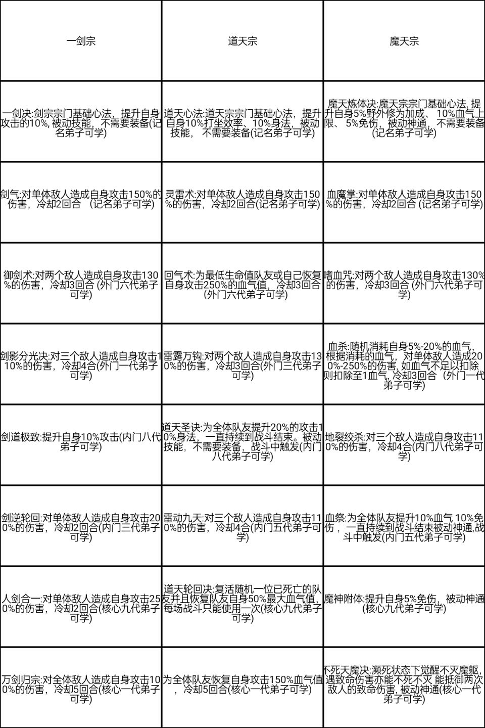 #游戏日常 1.宗门选择:道天打坐修为有10%额外加成,能提供队伍10%额外速度,20%额外攻击,属于辅助类型。一剑能提供自身20%攻击,属于输出C。魔天野外挂机修为有5%额外加成,能提供队伍5%伤害减免,属于坦克。 队伍最好1魔天1道天1一剑,组成固定队伍副本和野外挂机,稳定快速推图升境界。(氪佬的力量随意玩) 2.境界修为来源副本、打坐、野外挂机和修为丹。打坐加成靠服饰、道天、丹药加成,