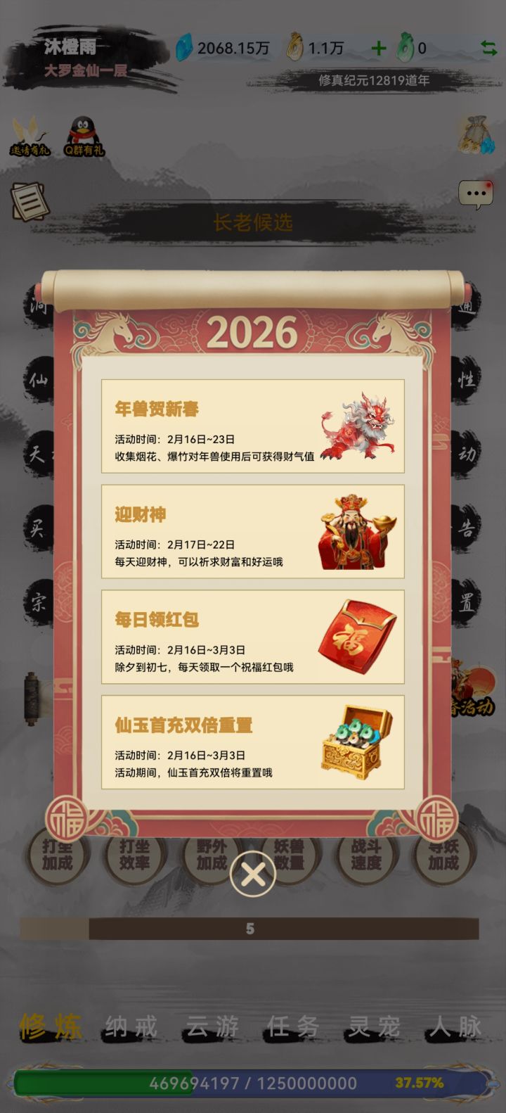 各位道友:新春将至,《仙境苍穹》将在2月16日11:00开启新服“禧岁灵霄”。为庆祝新服开启&新春来临,开启“仙境苍穹过新春”的晒图活动活动时间:2026/02/16-2026/03/03活动奖励:奖品:仙玉x1888、打坐加成礼包x2、野外加成礼包x2【参与方式】本次活动需以图文形式在《仙境苍穹》论坛发布新帖,发帖晒出新春系列活动相关元素的游戏截图,即可领取奖励,例如年兽贺新春、迎