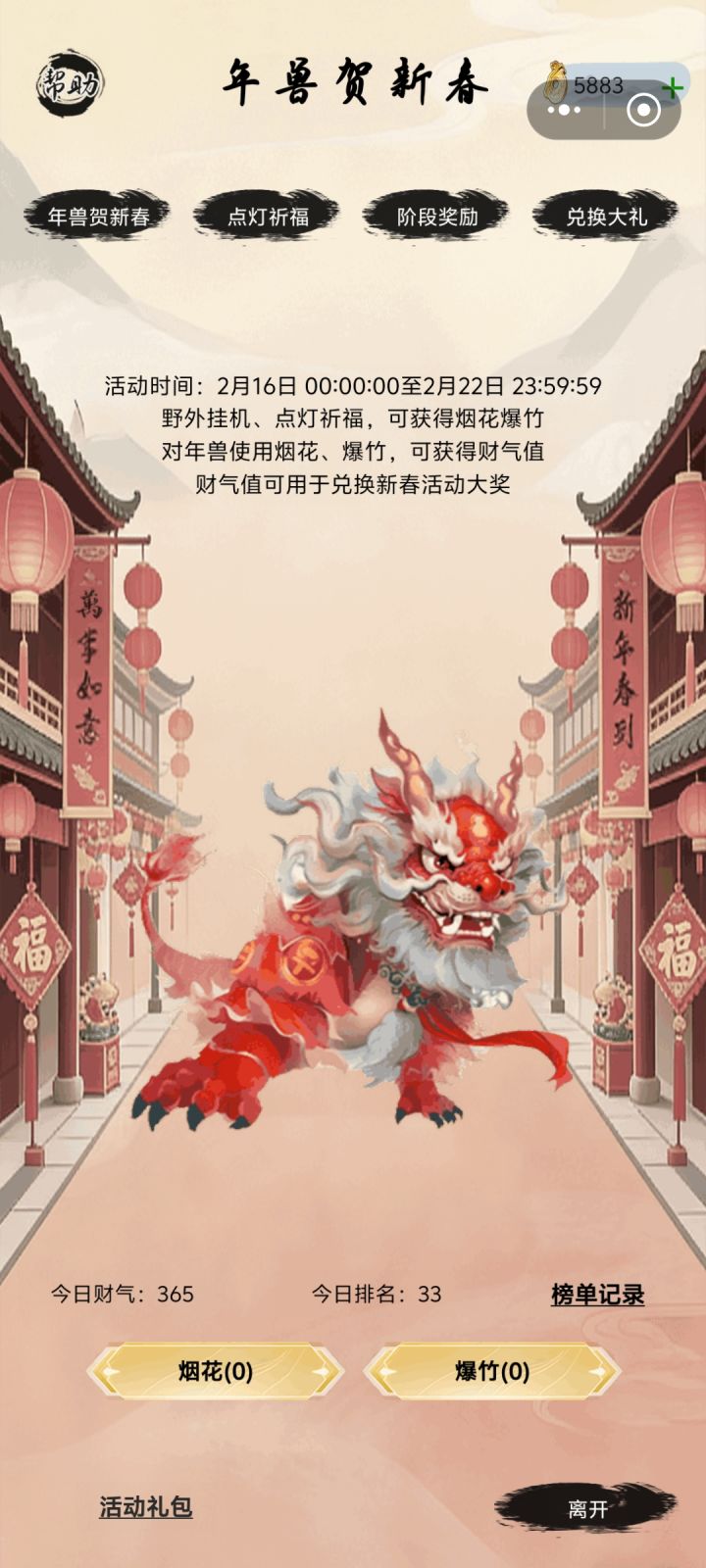 各位道友:新春将至,《仙境苍穹》将在2月16日11:00开启新服“禧岁灵霄”。为庆祝新服开启&新春来临,开启“仙境苍穹过新春”的晒图活动活动时间:2026/02/16-2026/03/03活动奖励:奖品:仙玉x1888、打坐加成礼包x2、野外加成礼包x2【参与方式】本次活动需以图文形式在《仙境苍穹》论坛发布新帖,发帖晒出新春系列活动相关元素的游戏截图,即可领取奖励,例如年兽贺新春、迎
