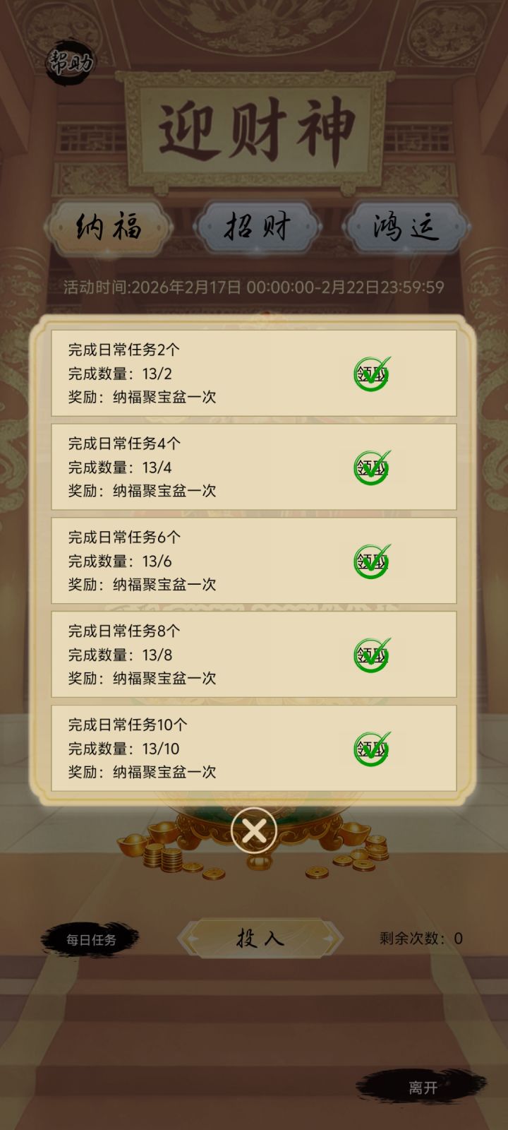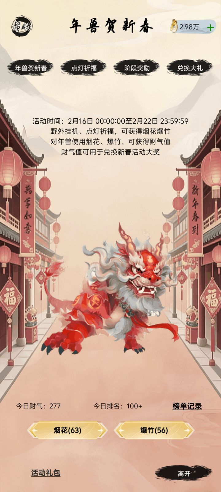 各位道友:新春将至,《仙境苍穹》将在2月16日11:00开启新服“禧岁灵霄”。为庆祝新服开启&新春来临,开启“仙境苍穹过新春”的晒图活动活动时间:2026/02/16-2026/03/03活动奖励:奖品:仙玉x1888、打坐加成礼包x2、野外加成礼包x2【参与方式】本次活动需以图文形式在《仙境苍穹》论坛发布新帖,发帖晒出新春系列活动相关元素的游戏截图,即可领取奖励,例如年兽贺新春、迎