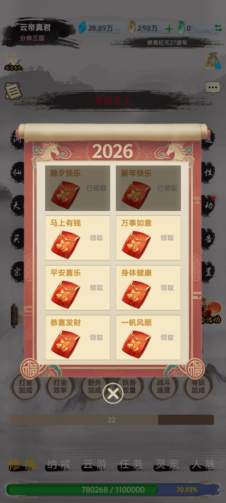 新手开局先薅满福利:24小时内进修炼界面“设置”,填接引码:l0Ryd3b7OzZOxjq+礼包码shenmo666等,加官方群领万枚仙石,再去“充值-特权”领免广告卡。职业首选道天宗(辅助加攻+打坐经验加成)或一剑宗(20%攻击加成),零氪微氪组队开荒更顺畅。仙玉优先升洞府灵脉和药田,黑市5折以下灵石、7折法宝碎片果断入手。元婴后组固定队,互拜师享10%野外经验加成。每日必做锁妖塔、深渊副本,