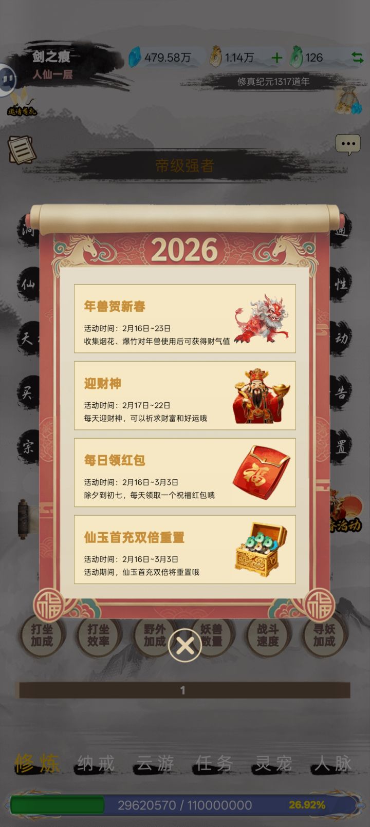 新手开局先薅满福利:24小时内进修炼界面“设置”,填接引码:l0Ryd3b7OzZOxjq+礼包码shenmo666等,加官方群领万枚仙石,再去“充值-特权”领免广告卡。职业首选道天宗(辅助加攻+打坐经验加成)或一剑宗(20%攻击加成),零氪微氪组队开荒更顺畅。仙玉优先升洞府灵脉和药田,黑市5折以下灵石、7折法宝碎片果断入手。元婴后组固定队,互拜师享10%野外经验加成。每日必做锁妖塔、深渊副本,