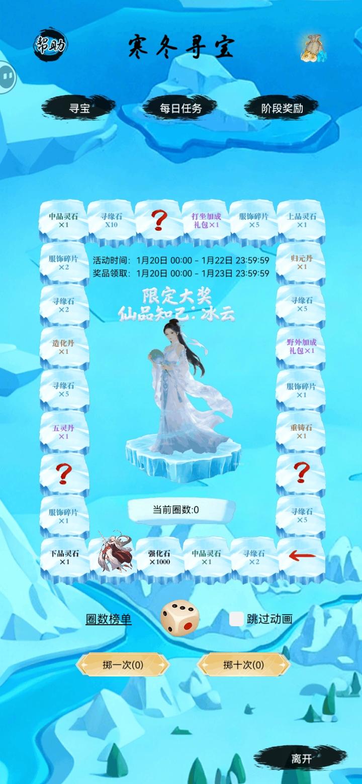 各位道友:《仙境苍穹》1月2日12:00开启新服“灵渊仙阁”。又有道友在此开启新的修仙旅程,新服开启之际,同步上线了“寒冬寻宝”活动,先开启“寒冬寻宝”的晒图活动活动时间:2026/1/20-2026/1/24活动奖励:仙玉x1888、打坐加成礼包x2、野外加成礼包x2【参与方式】本次活动需以图文形式在《仙境苍穹》论坛发布新帖,发帖晒出游戏内“寒冬寻宝”活动相关元素的游戏截图,即可领取奖