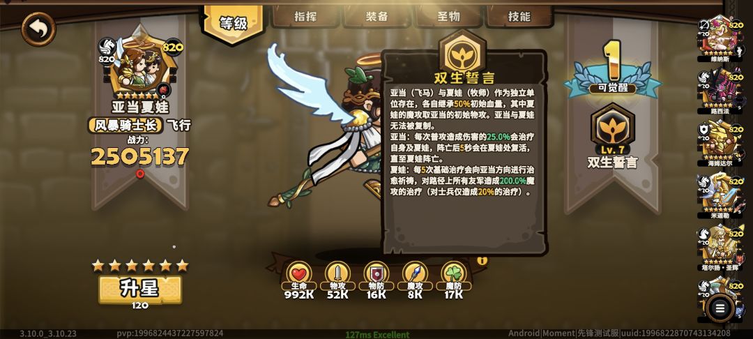 杨戬 t0限定枪,圣物3提升最大生命上限已生效,但目前不计入统计面板,大招的初始技能和圣物5的目标人数增加了10队,提升挺大。 亮点一:大招每10秒打18队真伤,满圣物打30队,扇形范围输出,枪系自带攻击高,本体输出属于顶尖。 亮点二:自带狗子,游戏中分身与召唤物的区别只在于血量,攻防是全面继承的,当然满星后狗子血量也来到100%,意味着开局自带一个不会放大的杨戬,会帮本体分摊伤害,3星圣物
