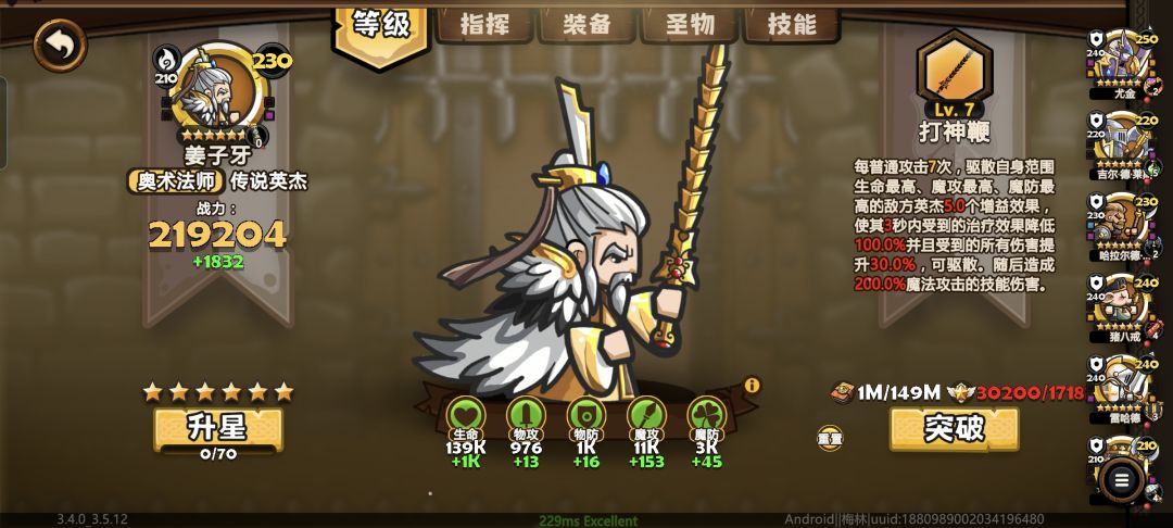 t0.5姜子牙 辅助/输出型法师,描述看着非常难懂,其实就是打3个人200倍率伤害,消增益(紫弓),加受伤(摩根),以及禁疗(高文)。圣物都是输出词条,5圣后多打2人。 姜子牙满圣比0圣大约多一倍伤害,提升很大,输出和小白龙差不了太多,但辅助性可是强了不少,综合看比较满意,boss战发挥也很亮眼,输出非常高。 个人建议券不是很充足不用追求满圣,当做辅助位即可,池也涝,攒券抽后续的敖润,冰女这