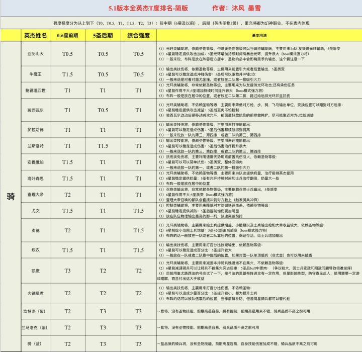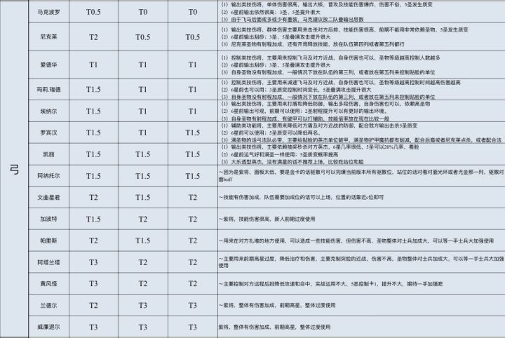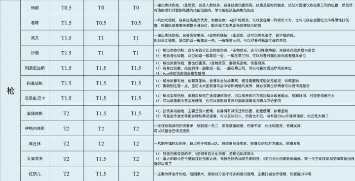 职业从左往右依次为法、弓、枪、骑、飞、战、盾、牧共8大职业。 综合评定,星级共通,包括前期后期以及高氪玩家手中同一英杰强度也有不同,相同星级也分先后,星数越多代表着上限越高强度越高,强势英杰更具体的解析可以看我相关帖子。 简单换算:10星将约为强力t0,注意不单指稀有度不同,9星普通t0,8星为t0.5强度,7星及以下为t1强度,无法担当核心,多用来补强或过渡,而低星纯是陷阱,11星t-0