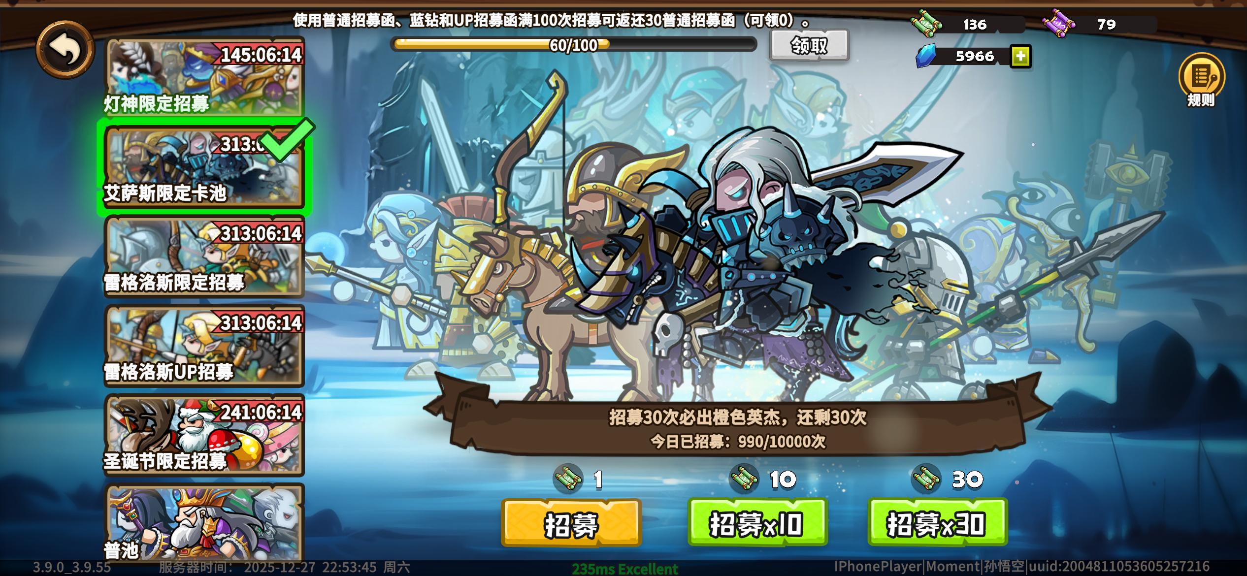 官方稀有度T0,实战强度T0,推荐抽取SSS,定位为骚扰功能骑一、主动技能1️⃣战斗开始触发,圣诞老人无法被双方索乱并无法被探测(直至友军剩余不足15名英杰时结束)不会参与争斗。-可理解为老头战斗后处于隐身状态中,自身不会攻击敌人,只有召唤出来的雪人才会造成伤害,老头的隐身无视橡木盾的探测2️⃣每10秒触发,在当前位置派发一份【圣诞礼盒),礼盒7秒内未被拾取则自动销毁(有50%的概率生成随