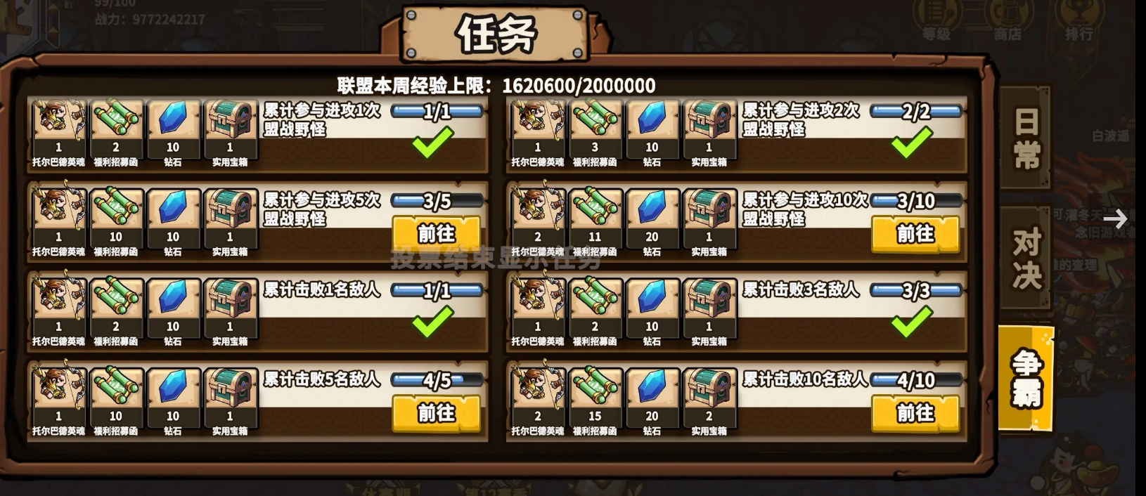 好消息是赈灾粮终于发了坏消息:是太少了吧,根本不够啊联盟争霸的任务现在太难做了,能不能简单一点?公会杀的野怪,所有人都能享受到,参加的都能拿啊,无论是自己联盟的,还是对面联盟的,只要参加就给现在任务各种难做,如果说是小公会,根本就抢不到野怪吧,如果是新手号,根本就不可能完成击杀的