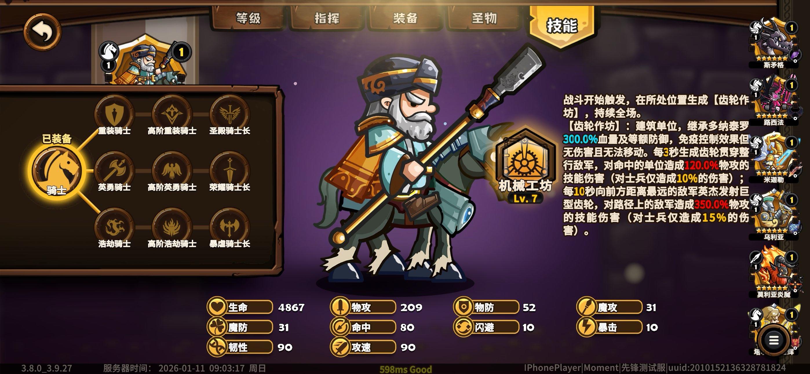 定位为,远程百分比弓箭,专杀英杰;主要依赖士兵输出;官方稀有度T0,强度T0,推荐抽取SSS一、主动技能主动技能分为三部分:限伤、百分比伤害、荣耀1️⃣ 【限伤】部队全员单次受到的技伤不超自身最大生命10.0%;克制大范围的Aoe伤害和单体伤害,比如被全图随机伤害的火龙等秒杀,也不怕被飞马突脸秒杀,尤其对脆皮的士兵提升巨大,保命能力极强2️⃣【百分比伤害】核心技能部队全员每3次攻击会