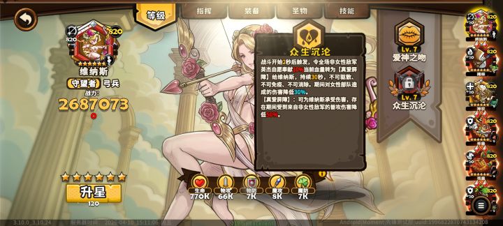 官方给的神将定位是和4w及以上的高氪将不分上下,现在又是弓法当道,老区蚩尤、灾焰已经下岗待业很久了,这个环境维纳斯作为弓核上线肯定是人权卡。 预计为梅林价格买或者肝半年白嫖,量力而行即可,代价还是挺大的。 具体以上线为准。 维纳斯的技能机制主要在性别,分两种,女性和非女性,像男英杰、雪灵、神兽都是非女性,不过亡灵复活的女性单位也算女性,珍、风行也变相加强了。 神将是大大英杰,攻击高,爽吃优