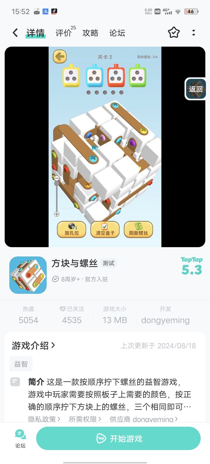 #发现好游戏 #单机游戏 手残爱玩游戏的我最近找到这个好游戏。不像其他的打螺丝一样,要玩到固定的层数才能看到下面的螺丝。有的螺丝基本上一清二楚。只要稍微动一动了,基本上就可以过关,不需要频繁的去看广告。15分钟左右一关,好玩又上头。#方块与螺丝