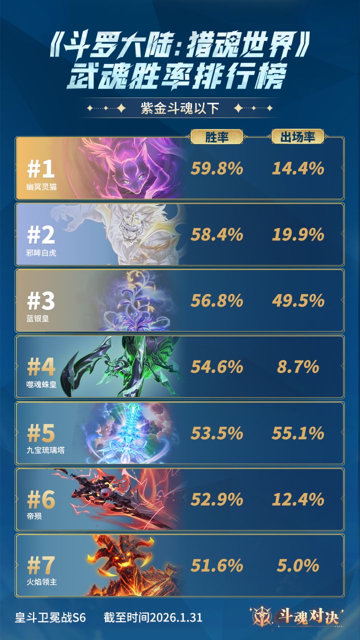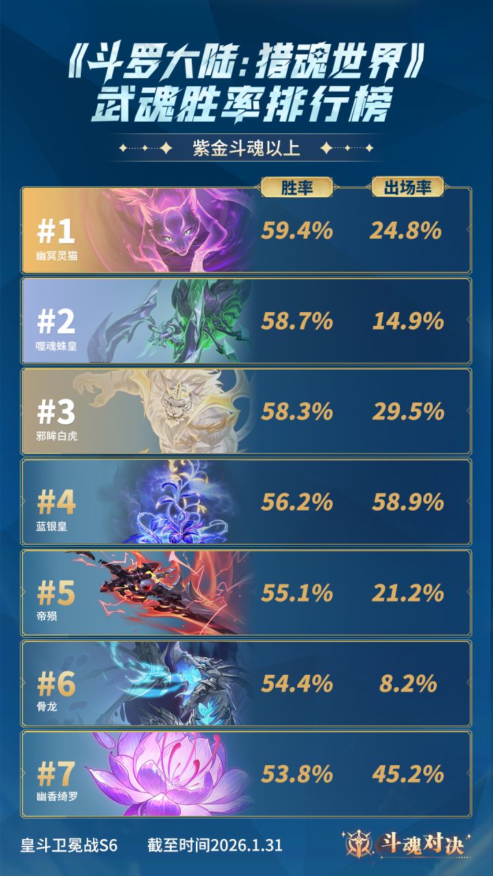 亲爱的魂师大大们~📢 1月斗魂对决玩法胜率TOP榜单火热出炉! 星斗映战勋,皇斗卫冕战·S6赛季已结束;感谢每一位魂师的热血奔赴,书写了属于猎魂世界的竞技传奇。 2026年1月1日-2026年1月31日期间: 本期紫金斗魂及以上段位的胜率前三名为:#1幽冥灵猫 #2噬魂蛛皇 #3邪眸白虎 本期紫金斗魂以下段位的胜率前三名为:#1幽冥灵猫 #2邪眸白虎 #3蓝银皇 风火燎原征·S7赛