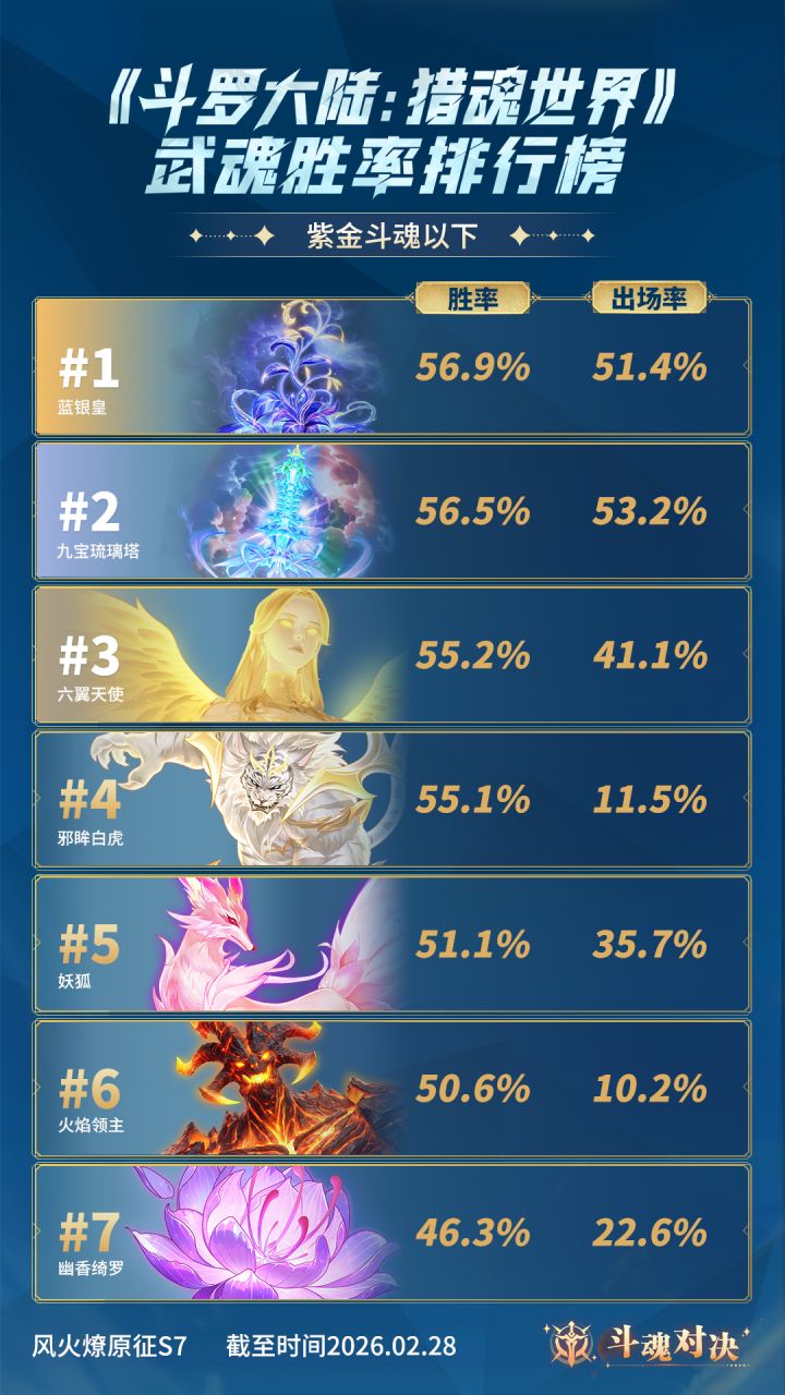 亲爱的魂师大大们~📢 2月斗魂对决玩法胜率TOP榜单火热出炉! 星斗映战勋,风火燎原征·S7赛季已结束;感谢每一位魂师的热血奔赴,书写了属于猎魂世界的竞技传奇。 2026年2月1日-2026年2月28日期间: 本期紫金斗魂及以上段位的胜率前三名为:#1噬魂蛛皇 #2帝殒 #3蓝银皇 本期紫金斗魂以下段位的胜率前三名为:#1蓝银皇 #2九宝琉璃塔 #3六翼天使 风火燎原征·S8赛季战火