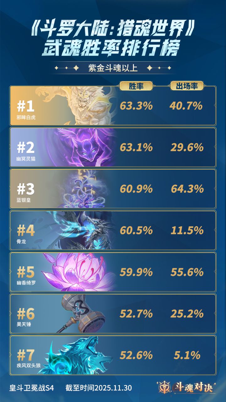亲爱的魂师大大们~📢 11月斗魂对决玩法胜率TOP榜单火热出炉! 皇斗卫冕战·S4赛季战歌终歇,荣耀定格! 2025年11月1日-2025年11月30日期间: 本期紫金斗魂及以上段位的胜率是✨前三名为:#1邪眸白虎 #2幽冥灵猫 #3蓝银皇 本期紫金斗魂以下段位的胜率前三名为:#1蓝银皇 #2幽冥灵猫 #3九宝琉璃塔 皇斗卫冕战·S5赛季是🏆战火已燃,全新征程开启。 无论是老