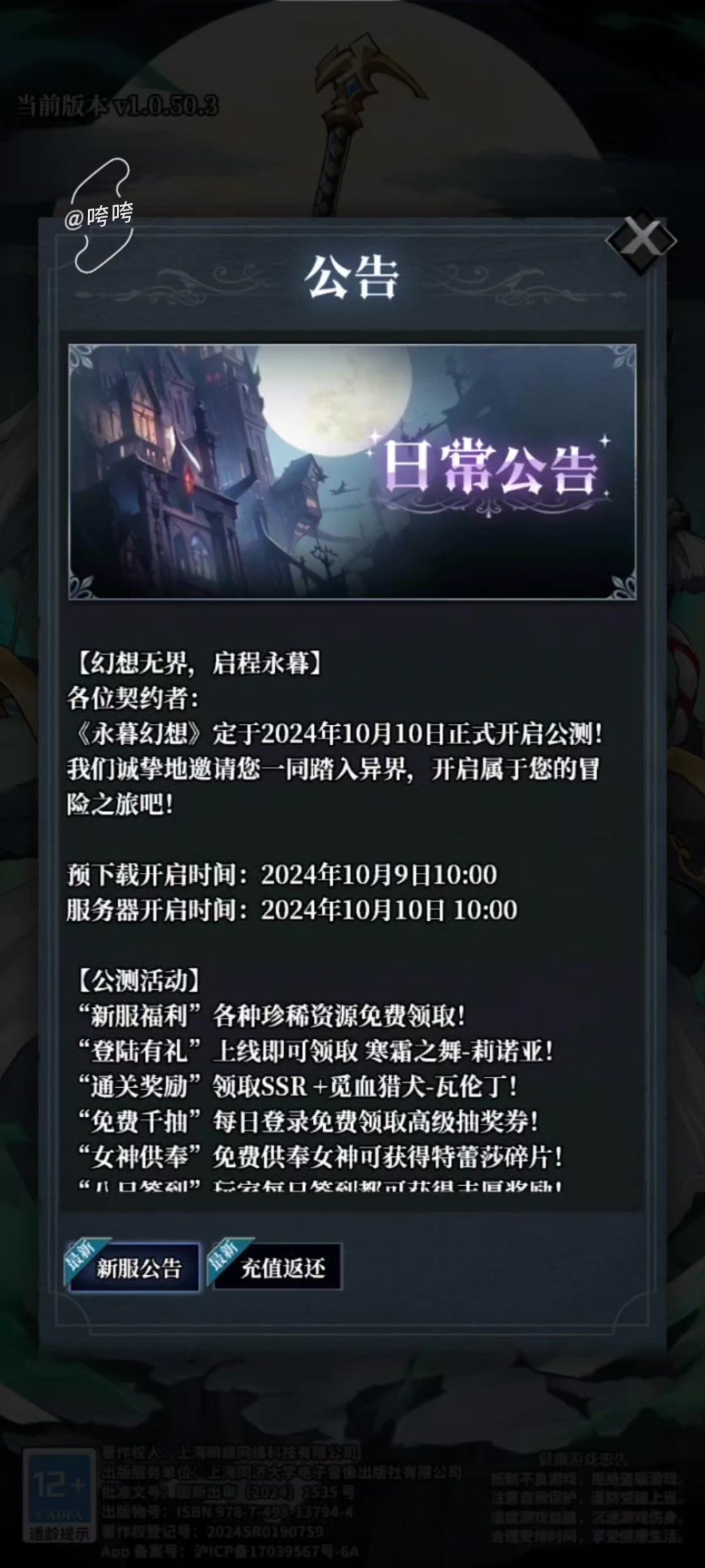 #永暮幻想 #永暮幻想首发 #游戏安利 #游戏安利 #游戏推荐 永暮幻想首发上线震撼来袭!《永暮幻想》是一款以中世纪欧洲为背景,哥特风格的放置类手机网络游戏。开局每日登录免费高级十连,供奉即可领取女神特雷莎碎片,通关更有SSR+英雄瓦伦丁等你来领!