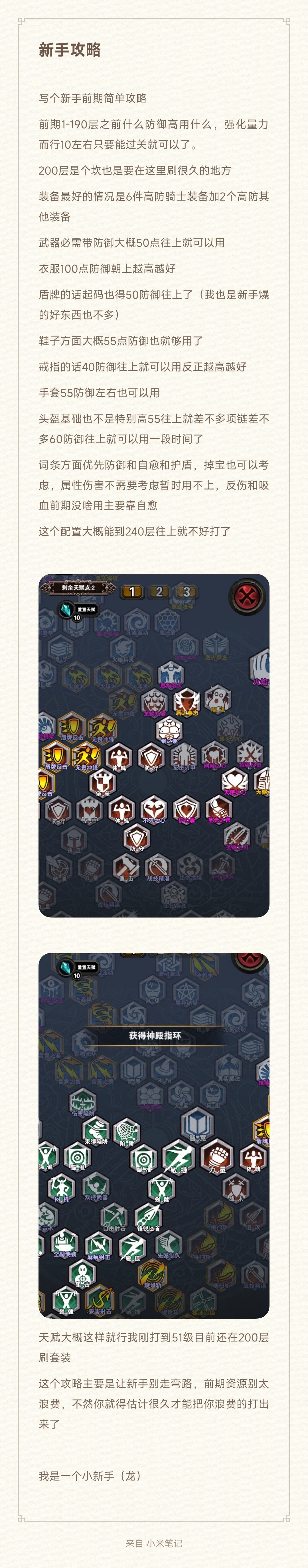 写个新手前期简单攻略(目前更新到340层) (反正发电300给的掉宝率还是挺好用的有条件可以搞) 这个攻略主要是让新手别走弯路,前期资源别太浪费,不然你就得估计很久才能把你浪费的打出来了 前期1-190层之前什么防御高用什么,强化量力而行10左右只要能过关就可以了。(可以同手装备四种血药磨过去) 200层是个坎也是要在这里刷很久的地方 装备最好的情况是6件高防骑士装备加2个高防其他装备血量最好有4