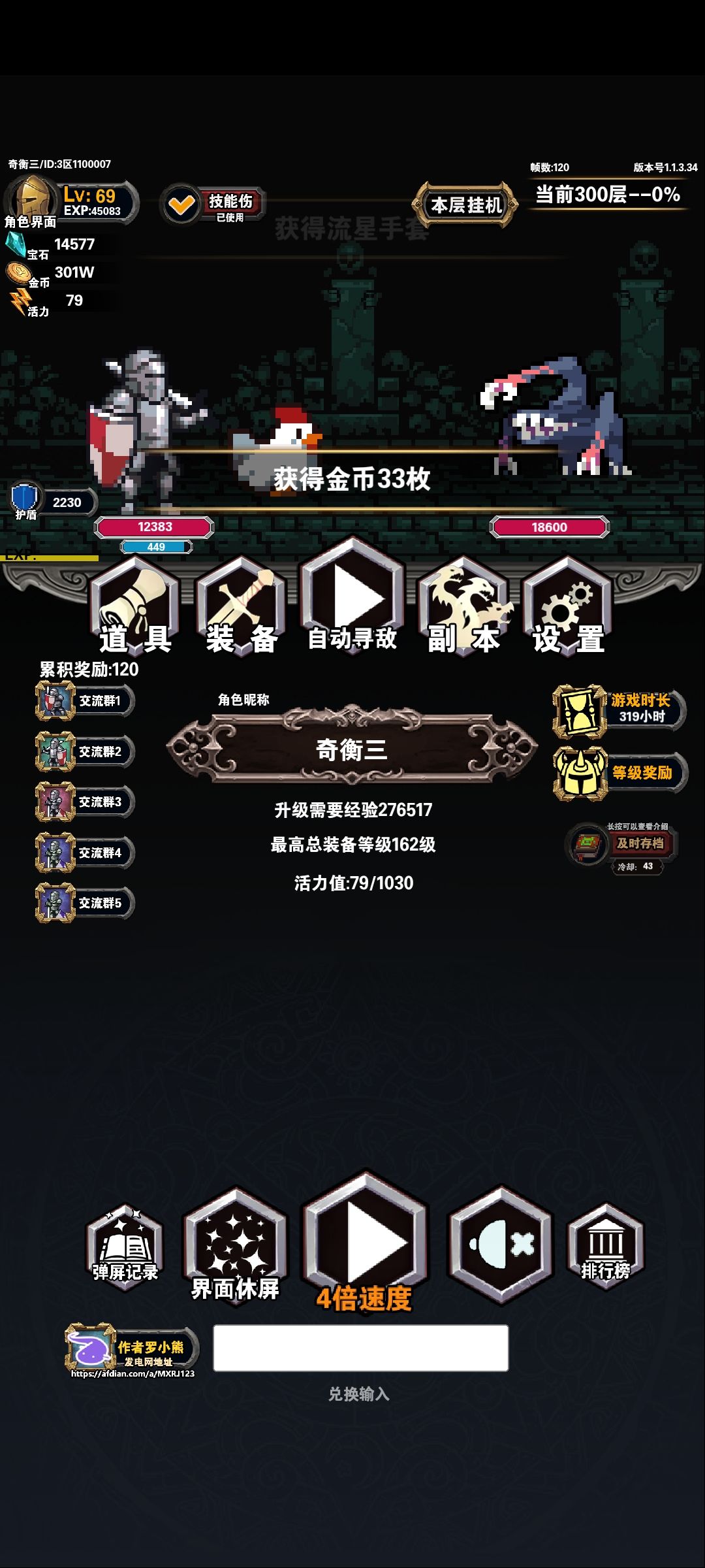 写个新手前期简单攻略(目前更新到340层) (反正发电300给的掉宝率还是挺好用的有条件可以搞) 这个攻略主要是让新手别走弯路,前期资源别太浪费,不然你就得估计很久才能把你浪费的打出来了 前期1-190层之前什么防御高用什么,强化量力而行10左右只要能过关就可以了。(可以同手装备四种血药磨过去) 200层是个坎也是要在这里刷很久的地方 装备最好的情况是6件高防骑士装备加2个高防其他装备血量最好有4