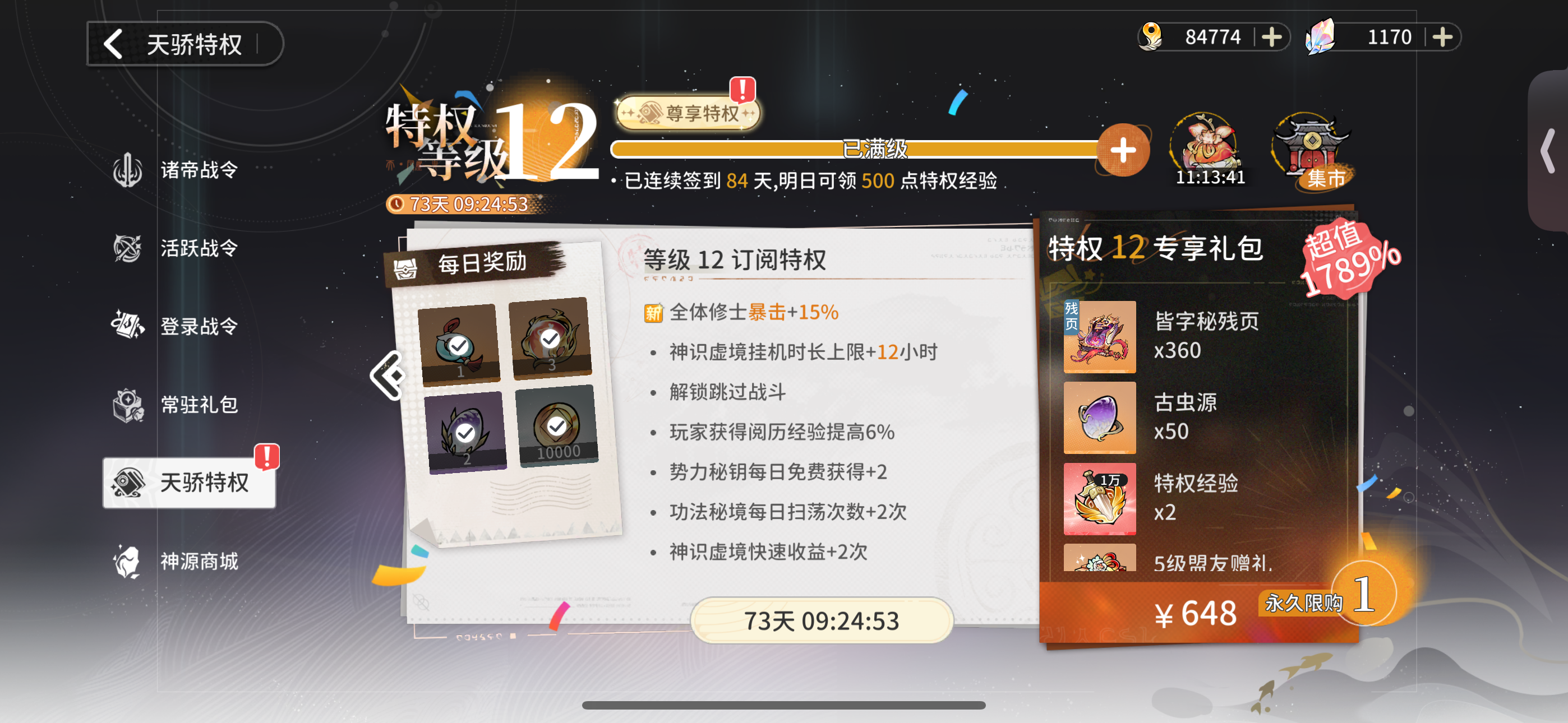 开服第75天6688万战 (下周预计快8000万)仙道664,神识939,秘境370(钥匙不够)拉了特权12,世家新角色,新法术,段德10星 提一嘴:神识的血能不能少些要加绿泡泡群的看主页卫星 #世家队 #大佬 #气运 #遮天凡尘一叶