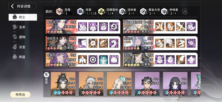 安妙衣+黑皇+姬紫月+姜婷婷+逆命c+逆命c 无论你选哪个流派都能凑 3流派+4逆命+4因果 安妙衣+黑皇必须得有 一个最强群体免伤 一个最强压血线 其他的你可以灵活自己搭配只要凑够4逆命4因果就好了 有人就要杠了:“这么多辅助一点伤害都没有!” 冷知识:辅助也能带输出法术,这游戏法术的伤害是大头“这么多心愿低星一点用都没有!” 那我问你,别的阵容低星就有用了?况且这四个辅助4星还真就能凑