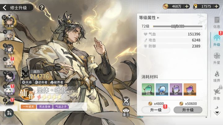 布阵台查看阵容,目前只有4套阵容养成难度:天命<传承<世家(血脉没有属性提升,3回合暴击也不持久,不推荐)卡池角色铁打的辅助,流水的C位T0:伊轻舞(上阵就全员加属性持续战斗结束,且伊轻舞死亡不消失)S:摇光圣子A+:阴阳圣女A+:柳依依新手3-7天开荒输出技能带灼烧,50%高级法术连击,后面可以转前排1号控制位置三大输出核心:推图就养王腾或者圣体叶凡,姬皓月单体输出偏向PVP