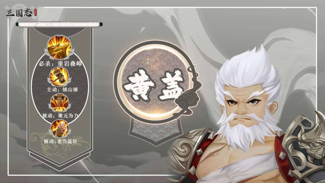 亲爱的主公们,大家好! 本期武将图鉴为大家带来的是“十二虎臣”——黄盖 【武将简介】 【阵营】吴国 【职业】防御 【定位】防守反击武将 【特点】反伤伤害高,而且反击的伤害也高,是近战武将克星。 【优势】具有高反伤和高防御能力,以及援护能力,能给队友带来良好的防护效果,保护队友进行战斗。 【获取方式】 1. 乌林山挂机 2. 信物交换 3. 信物商店 4. 信物礼盒 【技能解析】 【灵符选