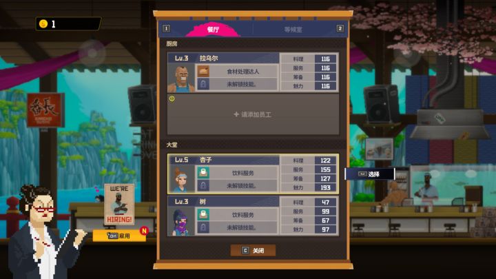 这⾥重点说⼀下截图中的树,作为⼀个招聘时候,唯⼀全属性都是1的雇员,当时我就觉得这货绝对不简单,后⾯招聘之后才发现这货的成⻓属性最⾼,⽽且也查了下攻略,果然后期满级是魅⼒最⾼,⽽魅⼒直接影响顾客评级,进⽽影响销售额。