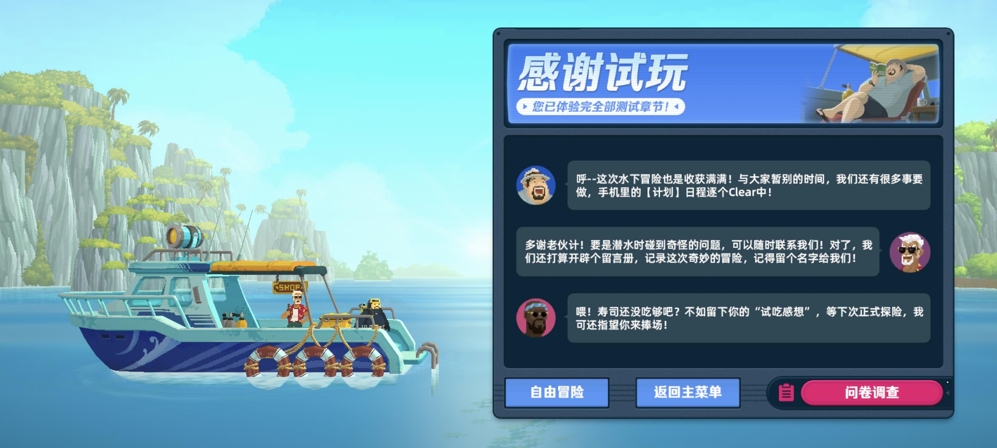 白天潜入瑰丽的海底世界,与鱼群共舞,在危机中捕获珍奇;夜晚经营寿司店,将收获化为料理,倾听顾客们的故事。《潜水员戴夫》体验版用“冒险+经营”的独特循环,构建出令人沉醉的像素海洋宇宙。动态光影与细腻动画让每个场景都充满生机,操作流畅易上手。短短几小时的体验已足够展现其丰富内核——既有探索的紧张与惊喜,也有经营的松弛与温暖。试玩结束意犹未尽,已开始期待正式版更广阔的海域与更深度的叙事。😍😍😍