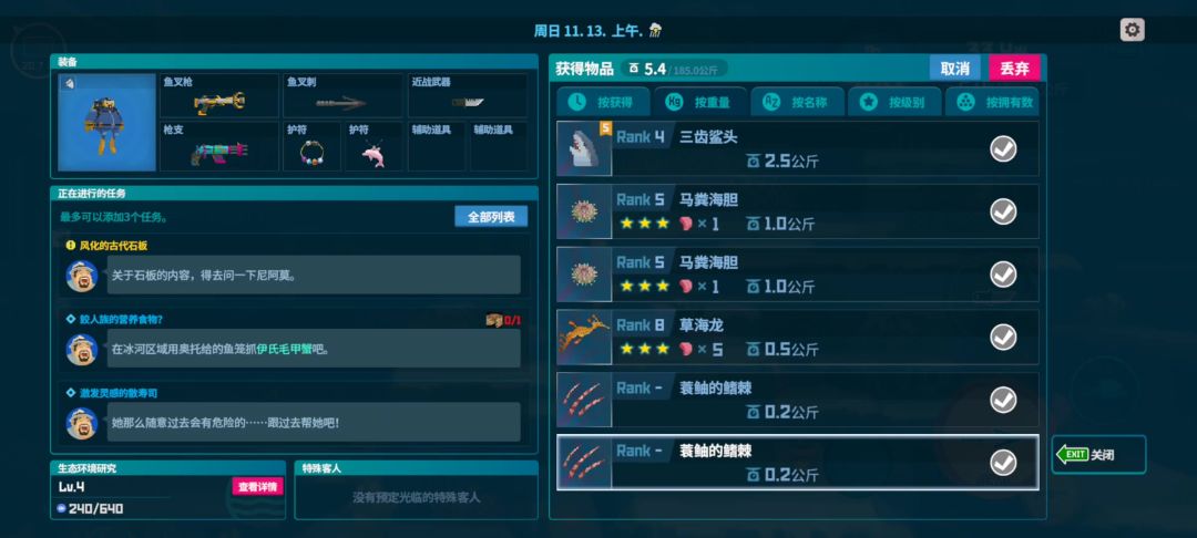 众所周知,潜水员戴夫的装载箱标注的额定载重并不意味着只能装这么多,再装多点也行,只是会超重影响移速,直到装不下 我们贪夫要做的就是塞满装载箱,塞到装不下为止,并且在彻底装满之前尽可能多装点东西 那么熟知极限载重临界点就能帮助我们更好地装更多东西,如果我们在达到临界点之前塞一条重一点的大鱼进去,就能带更多重量上岸,每0.1公斤都是贪夫收获的喜悦! 举个例子: 例如7级装载箱的极限载重临界点是109公