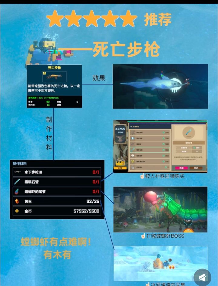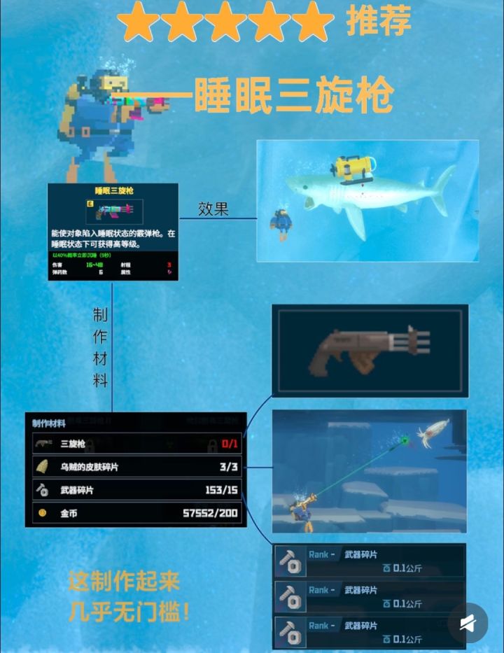 还在为打不过BOSS、抓不到三星鱼发愁?选对武器真的能救命!这份保姆级攻略帮你从“潜水萌新”变身“蓝洞海王”,速速码住!🎯 必做武器推荐睡眠三旋枪(前期神枪):两三发就能让鲨鱼“睡着”,配合无人机直接活捉,打BOSS时也能控住无伤输出,材料好搞建议第一个做!钢铁网枪(捕鱼之王):中期解锁后效率起飞,一网兜住金枪鱼群、旗鱼,连3星螃蟹、青瞻星鱼都能轻松搞定。死亡步枪(输出核心):单发80伤害
