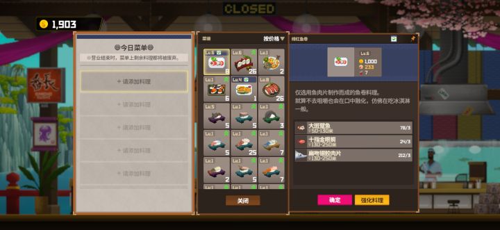 10.01,眩晕锤全抓蛋黄水母卖寿司371金币,有个机制是不抓够7条鱼上岸不会结束这一天,还能继续下潜抓鱼搜集资源,直到抓够7条鱼,我觉得这有点太bug了,不打算利用,就正常一次下潜抓够鱼上去了10.02,抓三齿鲨头备用,抓鹦嘴鱼卖寿司377金(后话:考虑到鹦嘴鱼寿司只在今天卖了一次,那今天除了三齿鲨头,也可以继续用眩晕锤全抓蛋水母,还需37块肉=12.3只蛋水母能把寿司从昨天的5级升到7级,加