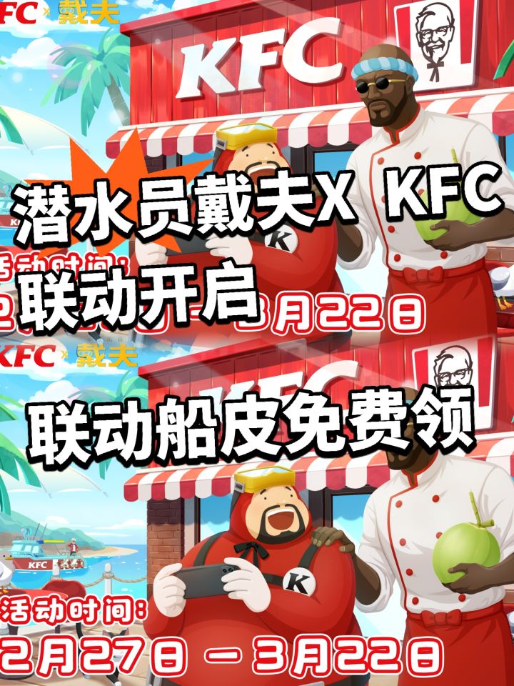 大的来了家人们!就在今天2月27日,KFC和《潜水员戴夫》的限时联动正式开启了,活动会一直持续到3月22日,这波联动让不少玩家都很开心。 只要是玩《潜水员戴夫》手机版或者TapPC版的玩家,登录游戏就能直接领免费的联动限定船皮,名字叫吮指快艇,白给的福利大家都乐意领。 除了游戏内福利,还有实体联动的大神卡。3月1日开始,会上线戴夫联名主题的大神卡,卡面是戴夫的专属设计,很有收藏意义不过这