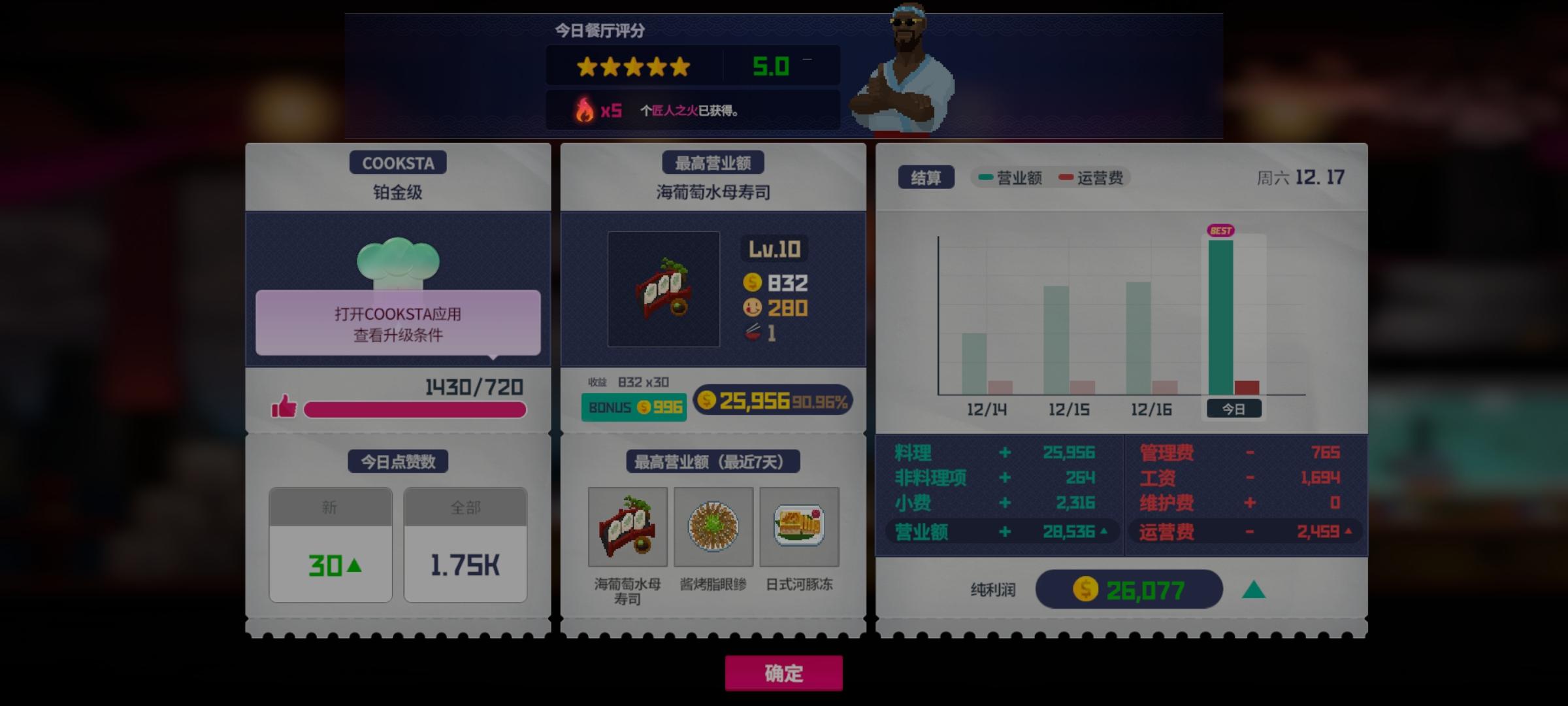 #与班乔厨艺对决 测试版本下店铺经营:一、店铺经营时我们需要注意的几项因素:①为客人上菜:一定时间内未上菜将会红脸导致差评②擦理客人离开后的桌子:下一位客人来到桌子后不尽快处理则会红脸导致差评③倒茶、啤酒:可以使客人心情愉悦,花费更多钱不及时处理则红脸导致差评④抹芥末:(位于吧台最右侧)不及时处理则会导致班乔无法制作料理,剩余客人全体红脸导致大量差评二、菜单上的推荐料理:前