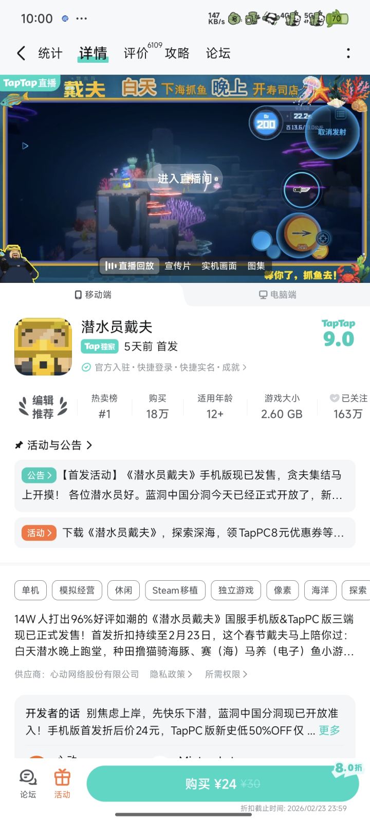 今天刚上手《潜水员戴夫》,本来只想随便玩半小时试试水,结果一晃眼几小时过去,直接被这个“海底摸鱼+寿司店经营”的组合拳拿捏了!作为纯新手,从一开始手忙脚乱怕被鲨鱼追,到后来慢慢摸清门道,边捕鱼边开店的快乐真的太上头了,忍不住来TapTap跟大家唠唠我的真实游玩感受~作为手游端玩家,必须夸夸游戏的操作适配,本来还担心搓玻璃玩潜水会不顺手,结果发现虚拟摇杆的指向性特别精准,鱼叉瞄准、躲避攻击都很丝滑
