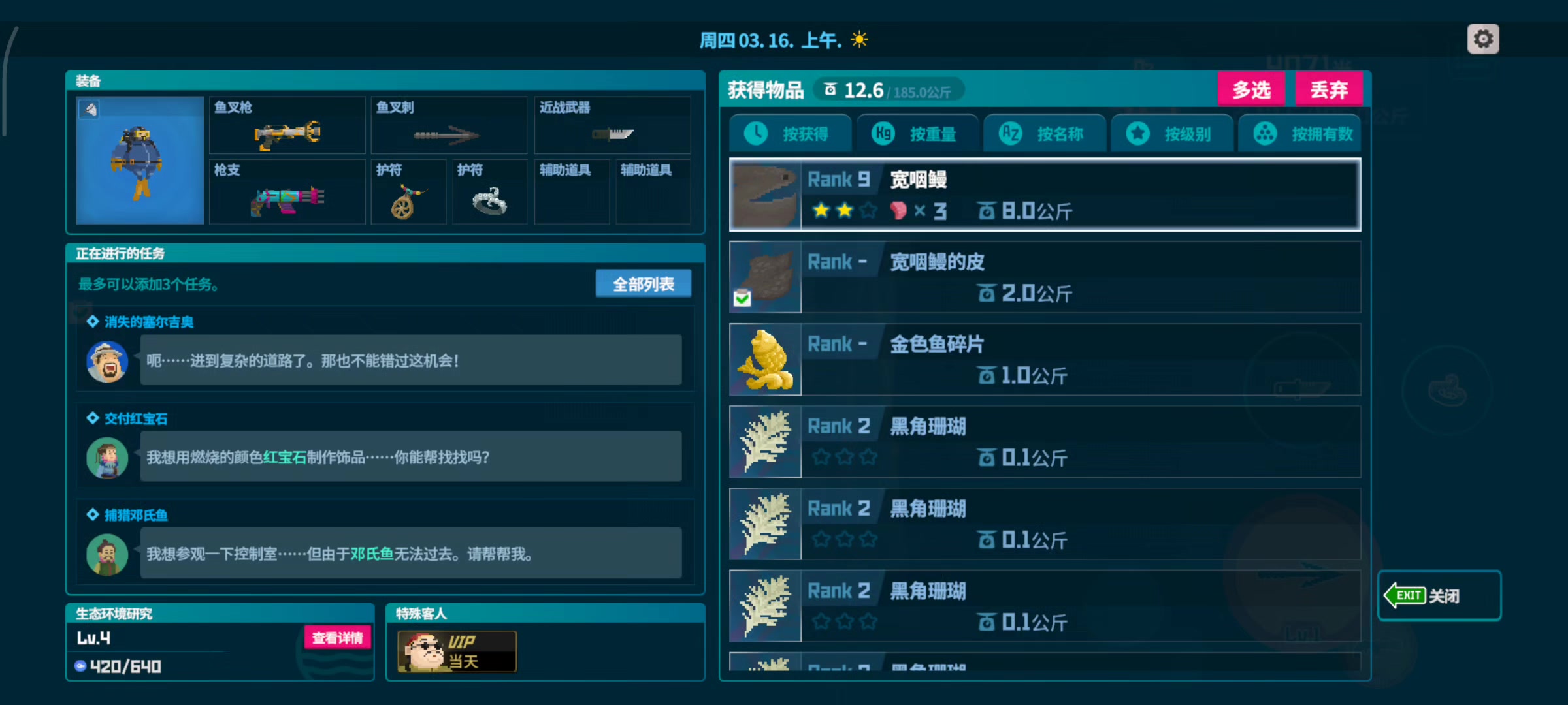 10.01,眩晕锤全抓蛋黄水母卖寿司371金币,有个机制是不抓够7条鱼上岸不会结束这一天,还能继续下潜抓鱼搜集资源,直到抓够7条鱼,我觉得这有点太bug了,不打算利用,就正常一次下潜抓够鱼上去了10.02,抓三齿鲨头备用,抓鹦嘴鱼卖寿司377金10.03,早上升级装备潜水服3级,装载箱4级负重28~41kg,算上任务给的金币刚好够升,剩余3金币,今天下海抓了三齿鲨头2.5kg+两条锯齿鲨26k