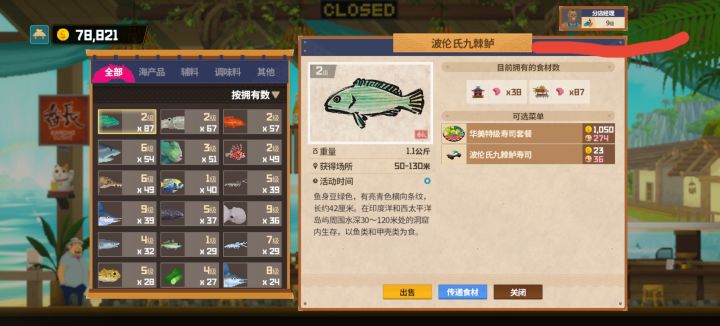 10.01,眩晕锤全抓蛋黄水母卖寿司371金币,有个机制是不抓够7条鱼上岸不会结束这一天,还能继续下潜抓鱼搜集资源,直到抓够7条鱼,我觉得这有点太bug了,不打算利用,就正常一次下潜抓够鱼上去了10.02,抓三齿鲨头备用,抓鹦嘴鱼卖寿司377金10.03,早上升级装备潜水服3级,装载箱4级负重28~41kg,算上任务给的金币刚好够升,剩余3金币,今天下海抓了三齿鲨头2.5kg+两条锯齿鲨26k