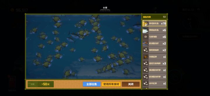 10.01,眩晕锤全抓蛋黄水母卖寿司371金币,有个机制是不抓够7条鱼上岸不会结束这一天,还能继续下潜抓鱼搜集资源,直到抓够7条鱼,我觉得这有点太bug了,不打算利用,就正常一次下潜抓够鱼上去了10.02,抓三齿鲨头备用,抓鹦嘴鱼卖寿司377金10.03,早上升级装备潜水服3级,装载箱4级负重28~41kg,算上任务给的金币刚好够升,剩余3金币,今天下海抓了三齿鲨头2.5kg+两条锯齿鲨26k