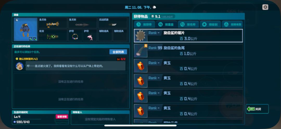 10.01,眩晕锤全抓蛋黄水母卖寿司371金币,有个机制是不抓够7条鱼上岸不会结束这一天,还能继续下潜抓鱼搜集资源,直到抓够7条鱼,我觉得这有点太bug了,不打算利用,就正常一次下潜抓够鱼上去了10.02,抓三齿鲨头备用,抓鹦嘴鱼卖寿司377金(后话:考虑到鹦嘴鱼寿司只在今天卖了一次,那今天除了三齿鲨头,也可以继续用眩晕锤全抓蛋水母,还需37块肉=12.3只蛋水母能把寿司从昨天的5级升到7级,加
